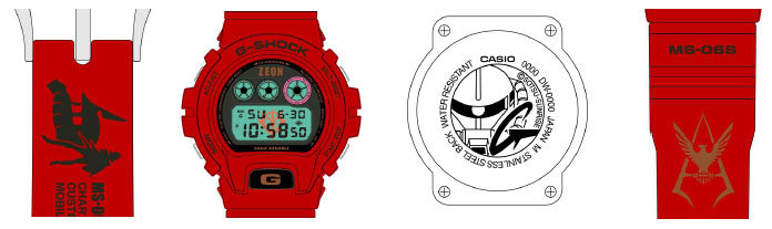 シャアザクモデルは「DW-6900」がベース。ベルトにはシャアのシルエットとシャアザクを描き、裏ぶたにはシャアザクと「G」の文字を刻印した。バックライト点灯時にはジオンマークが浮かび上がる。
