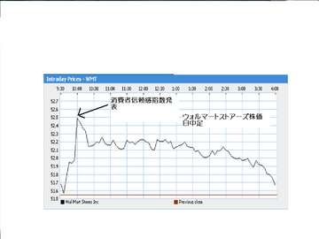消費者信頼感指数は54.1と、コンセンサスであった47.9を大きく上回りました。これをきっかけに、小売株などが買われました。ウォルマートの株価にも、その影響が鮮明に出ています。