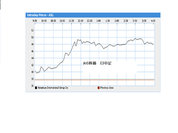 10時ごろまでは低迷気味でしたが、その後は着実に回復したのですが、主因は金融セクターの戻りでした。特に、AIGの上昇が目立ちます。新CEOに対する評価が高く、経営政策を打ち出す度に株価が上昇しています。