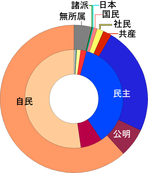 画像は前回の選挙での議席数のグラフ。内側が解散前、外側が選挙後。今回はどうなるのでしょうかね?