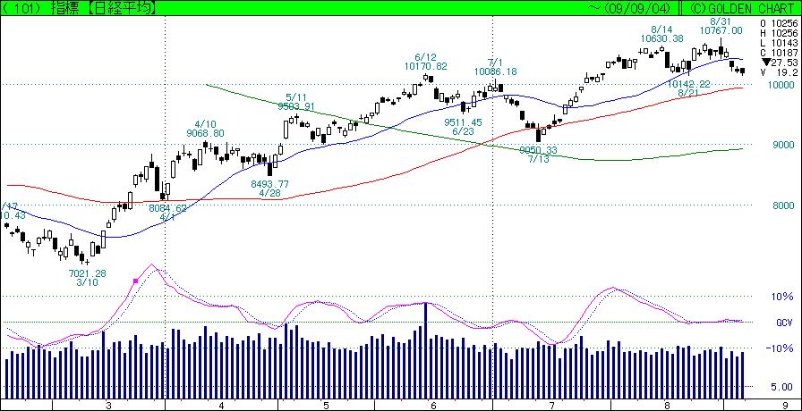 今のところ拙者下値予想は、日経¥10,000(75日線、13週線、3/10と7/13の下値支持線)と見ておりまする。ここを割らずに下げ止まれば、長期移動平均線は全て上向きなので、上昇相場継続と考えられ、いわば絶好の押し目となるかと存じまする。