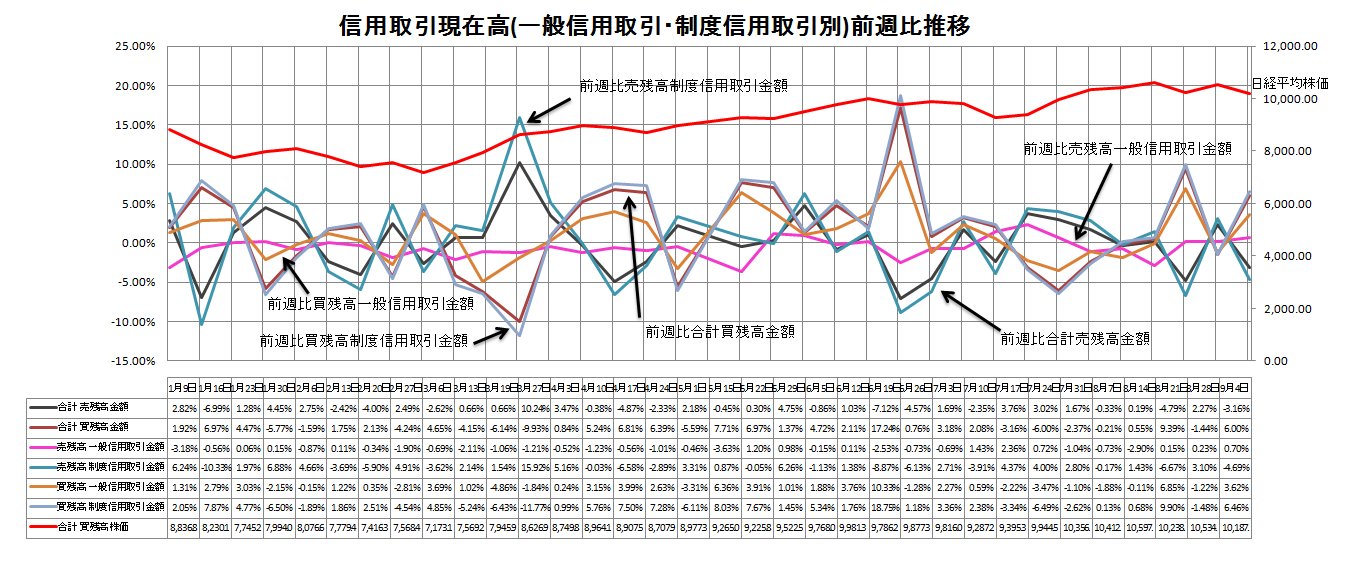 この週(8月31日―4日)は、前の週の8月26日に日経平均株価が1万668円の高値をつけたこともあり、相場は調整色が強まった。週末の取引時間中に日経平均は1万143円まで下げ、投資家は値ごろ感から買いを入れたとみられる。世界経済は最悪期を脱したとの見方から、今後株価が上昇すること見込んでいる投資家が多いようだ。信用売り残高は減少に転じた。売り残高は299億円減の9182億円だった。