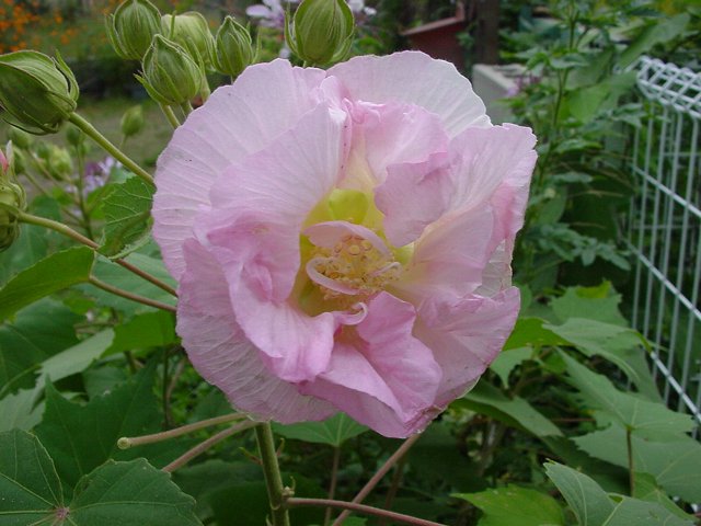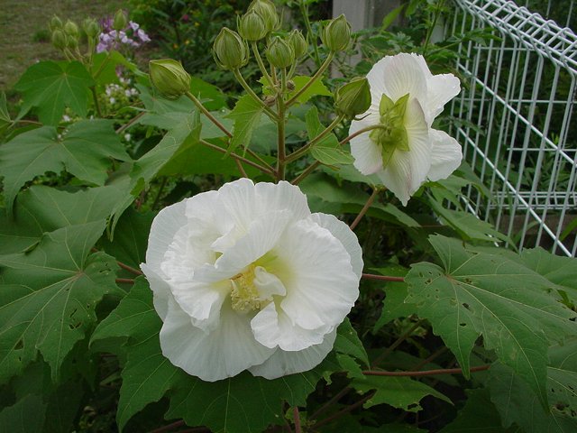 このフヨウ、咲き始めは白ですが、夕方はピンクになります、涼しくなると二日間花がもつので、白とピンクの花を同時に見る事ができます。