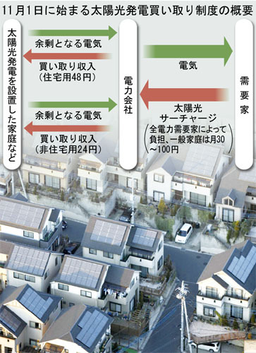 11月に始まる新制度で、電力会社は、住宅用太陽光発電の場合に余剰電力を1キロワット時当たり48円で買い取るが、この費用を来年度から、一般の電気代に「太陽光サーチャージ」として上乗せするからだ。これにより1世帯当たりの負担増は、月30~100円程度になる。