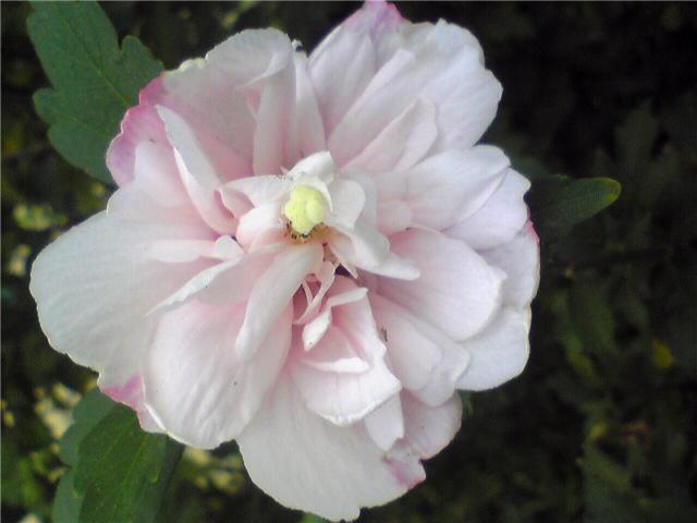 はな、ムクゲ、スイフヨウ:朝は白いスイフヨウだと聞きますがいろんな種類があるようです。花期が長く、夕方には赤い色が妖しいです。ハイビスカスとよく似ています。1.此花はムクゲのようですね??