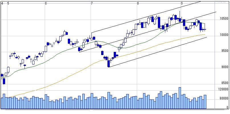 ・画像2の下値ライン10170近辺と画像1の真ん中ライン10140近辺、週足下値支持ライン10120近辺が重要な下値支持ラインと考えます。