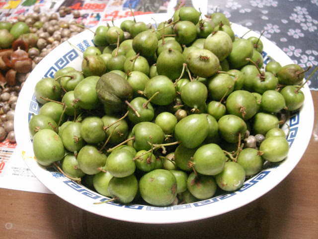 持ち帰ったものは未熟なもので、酸味がありますから、広げて干して熟させ、生食、ジャム、乾燥果物などにするか、このまま、焼酎に漬け込むわけです。