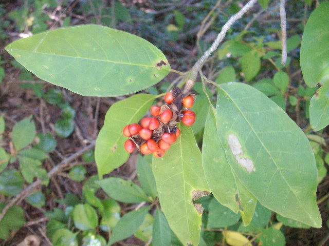 コブシかタムシバの赤い実:辛いらしい 花のつぼみを集めて薬用酒(鼻の病気に効くという)をつくったことがあるが、独特の鼻に抜けるような香り・・ちょうど、昔の病院の消毒薬の香りみたいな香り・・ があった
