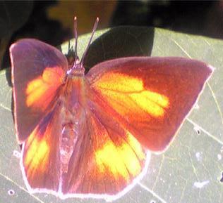 ちょう , ウラギンシジミ , 日向ぼっこ:ウラギンシジミもこの時期大忙し越冬に向けて花の蜜や、ジュースの残り、柿の実などに群がっています。人間が来てもジュースの残りを飲んでいる時など全く動きません。犬が餌を食べている時のように食いついたら離れません。そうかと思うとこのように日向ぼっこに来たりします。どれも動かないようにそーっと5cm~10cmに近づいています。