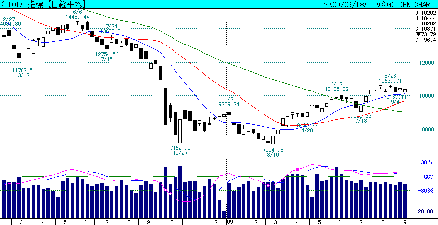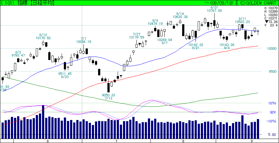三つ目の懸念は週足。中央青色のチャートで見ると、3週間前、8/31~9/4の週足は大陰線。その後2週間、陽線ながらこの大陰線を抜けておらず、仮に今週陽線で¥10,600を上抜けないと下げ三法となり、来週下落する可能性が出て参りましょう。ただ、今は長期上昇トレンドとしては崩れていないので、下がっても一時的かと思い、あまり悲観してはおりませぬ。