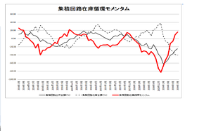 集積回路の在庫循環モメンタムは昨年12月の-82.8を底に、今年7月には16.3に達しています。