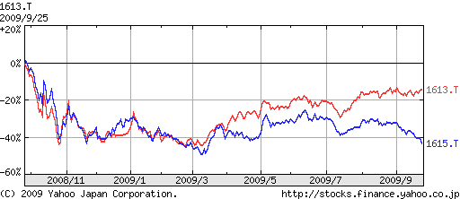最近、NT倍率が上がりっぱなしでちょいちょい注目されてます http://torashishiza.blog55.fc2.com/blog-date-20090925.html これをヒントに日経平均売りのTOPIX買いってのは面白みに欠けるので、さらに尖ったポジションとして1613売り1615買いってのを考えてみました。電機売りの銀行買い。
