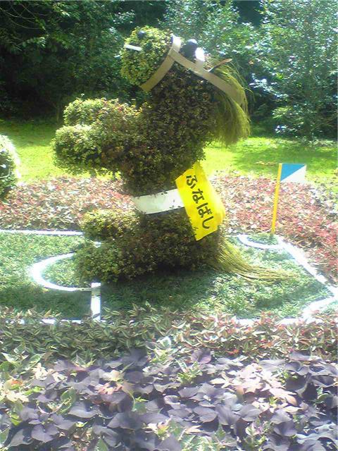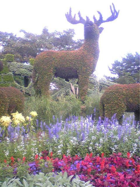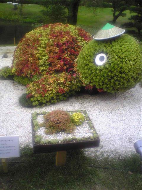 かめ , うま , しか:うまい飾り花の作り方です。亀、馬、鹿。ふなばしの宣伝ですね。北京の鹿。亀の後ろに偶然鳥が飛んできています。浜松モザイクカルチャー世界博より
