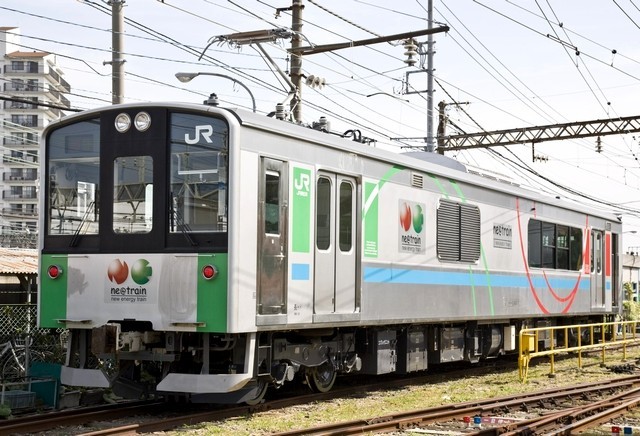 JR東日本はこのほど、「蓄電池駆動電車システム」を搭載した試験車両「NE Train スマート電池くん」が完成したと発表した。600V、163kWhのリチウムイオン蓄電池9ユニットを室内に搭載し、架線の電力を蓄電池用の電力に変換する装置を屋根上に搭載したという。最高速度は時速100kmで、航続距離は平坦路で約50kmとのこと~中略~