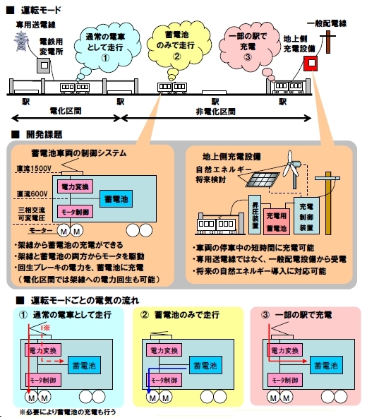 環境負荷を抑えるため電化区間は架線から電力を得ると同時に蓄電池に充電し非電化区間は蓄電池のみで走行する。