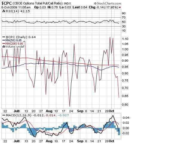現時点でプットコールレシオが過去のピーク時と並ぶレベルまで低下したので(昨日は下げ余地がまだあったのでダウの上昇余地はあったといえるけど)、プットに比べてコールが買われてる=総楽観といえるでしょう、、、