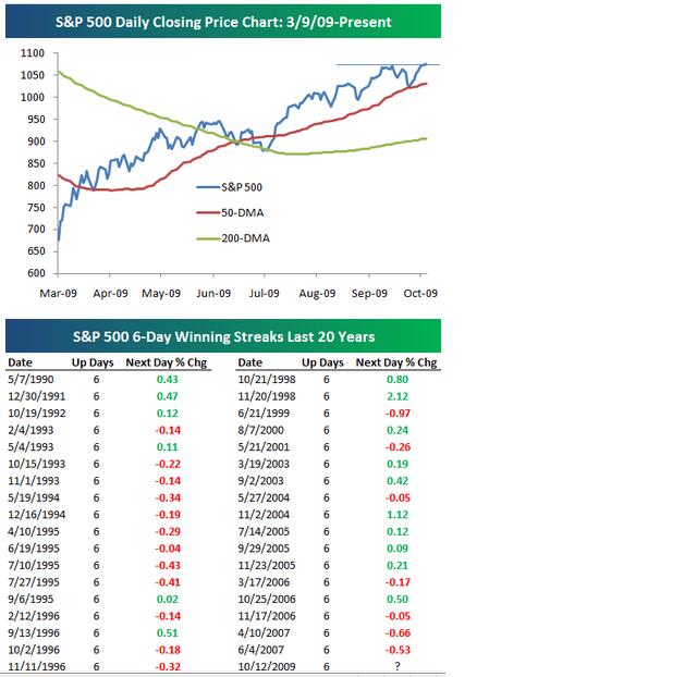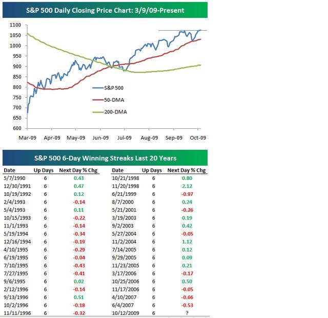 Today marked the sixth straight day of gains for the S&P 500. This is the first six-day gain for the index since June 2007. Going all the way back to 1927 for the S&P 500, the index has had 215 prior six-day winning streaks, and the average change on day seven has been 0.09%. This is six basis points higher than the average change of 0.03% for all trading days since 1927. In the second chart below, we highlight all six-day winning streaks for the S&P 500 over the last 20 years. Since October 1989, the average change on day seven has been 0.08%.