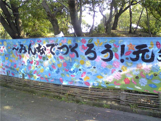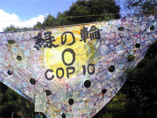 紅葉、COP10、大高緑地、お祭り、有松絞り:有松絞りののぼりが沢山でていました。大高緑地のお祭りです。COP10も題材です。紅葉も始まっています。子供達が沢山の絞りを作り張り合わせてあります。数十メートルの幕が作ってあります。10.17土10:00~