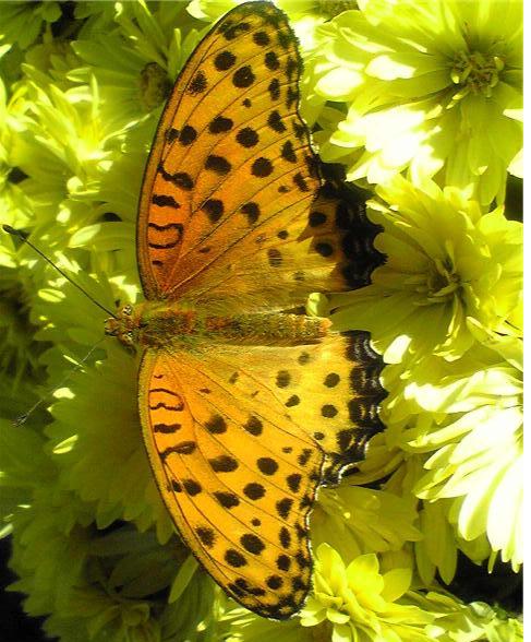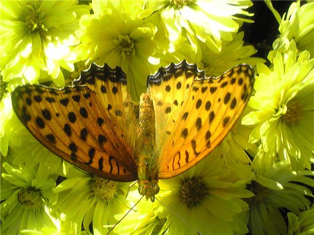 ちょう、はな、ツマグロヒョウモン、アカタテハ:ツマグロヒョウモン(オス)が菊に止まっています。アカタテハも菊人形に止まっています。名古屋城にて。