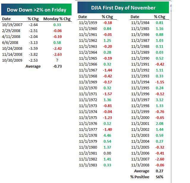 Over at Bespoke Premium, we just put out a report on November seasonality and the typical returns for the Dow in the last two months of the year. Next Monday marks the first trading day of November. Below we highlight the Dow's performance on the first trading day of November over the last 50 years. As shown, the average change on these days has been 0.27%, with gains 56% of the time since 1959. The last four starts to November, however, have been negative.