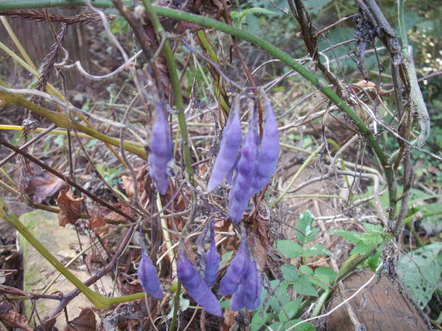 中の種は青黒いまん丸の種で、さやが割れても、しばらくは、さやにくっついています