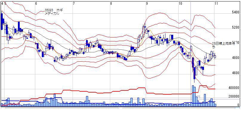 ・25日線が下向きから横ばいに変化し、横ばいの25日線を上抜いてきた(25日線が長期下落後に横ばいになってきたもの)