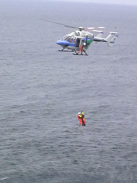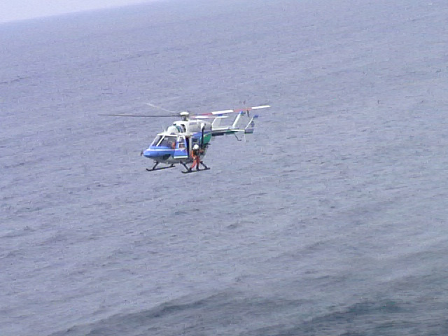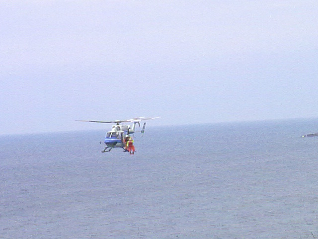 写真のとおり、ヘリコプターのレスキュー隊が救助するシーンを初めてみました。