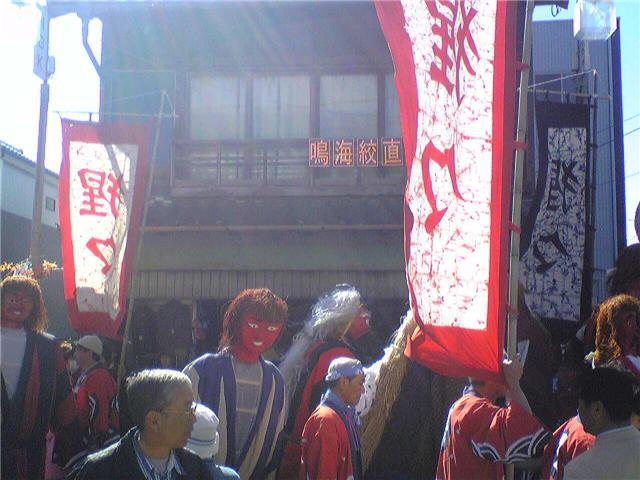 まつり , 鳴海宿場祭り , 猩猩:鳴海宿場祭り今度は、1.猩猩の軍団がうちわを持って子供をなでるや否や泣き出します。怖い、すごい行列です。2.踊りの猩猩チーム、毎年優勝しています。3.豊川稲荷の狐のお面もかわいいです。ただで絞り体験もでき面白いです。
