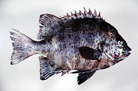 田布施町の漁業者が10月30日に刺し網で捕獲し、柳井市の魚市場に水揚げした。体長28・1センチ。生後約1年半の雄で成魚になりきっていない。イシダイにある帯状の模様と、イシガキダイにある斑点状の模様が、同時に出現している。