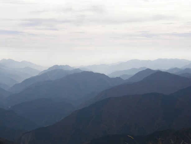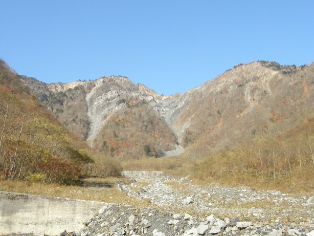 左の写真は登山口(扇の要)から、正面の山の低いところが「乗越新窪」、右の高い所が「大谷嶺」