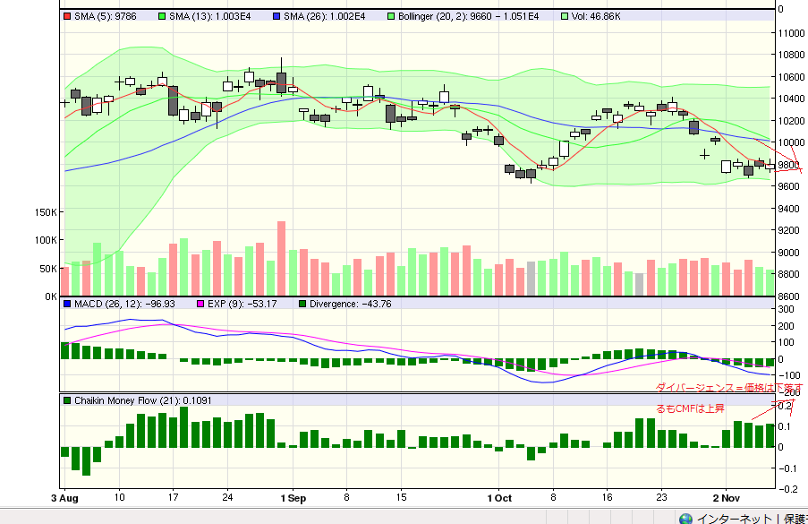 CMFが上昇をつづけるなら、株価も後追いで上昇するものと考えられる。