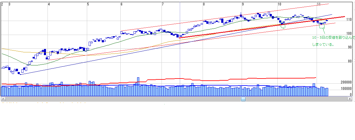 ドル建てだと11/5に10/5のの安値をわりこんでしまった(円建てではかろうじて維持)ので、10/20日の高値をぬかないと下落トレンド入りしてしまう可能性あり。