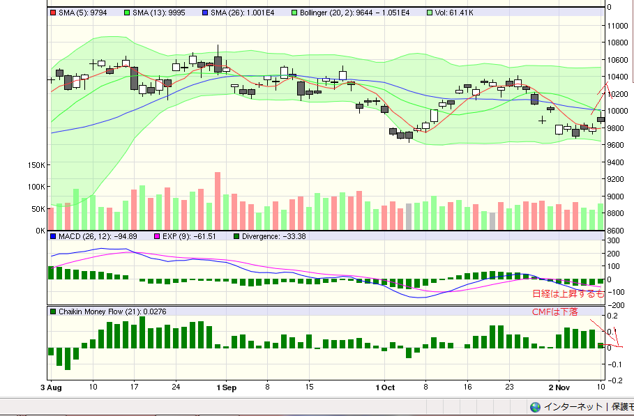 日経は上昇するも、CMFは低下しており、ダイバージェンスが生じています。