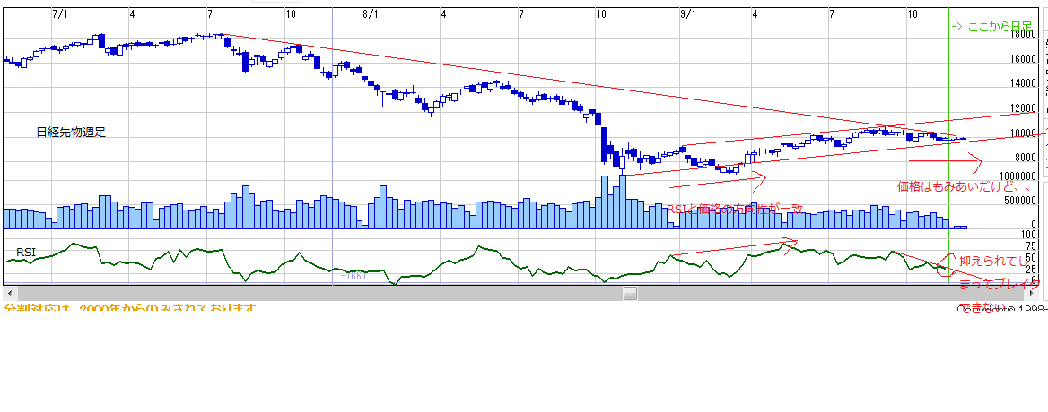 ・価格は持合がつづいていますが、RSIをみると、以前の高値をこえられてません。右肩下がりのトレンドラインにしっかり抑えられてしまってます。