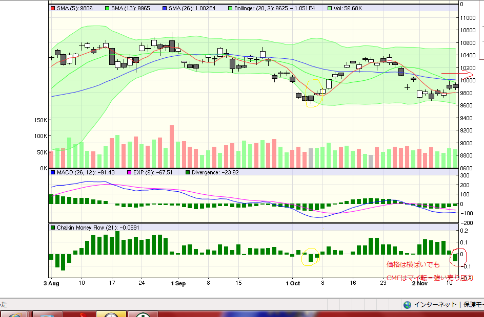 ・価格は横ばいでも、CMFは昨日ダイバージェンスをおこし、今日はマイ転しています。強い売り圧力を感じます。