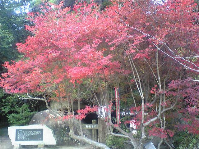紅葉、瀬戸、岩屋堂:岩屋堂という石組みの石室の周りに紅葉の名所。周囲の山では熊も出たようです。黄色い葉はこのまま黄色いままのようです。ライトアップもされます。
