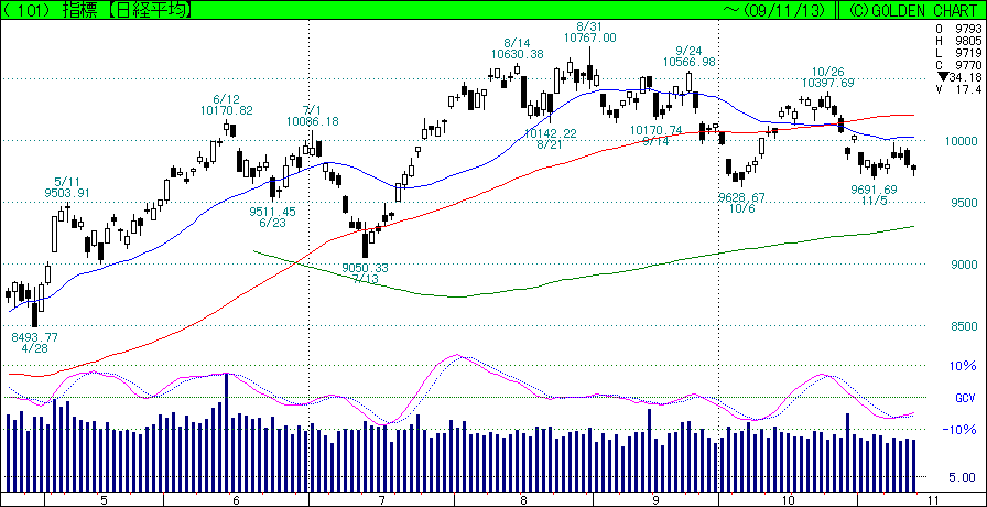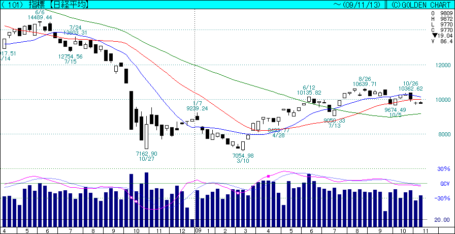 ただ相変わらず上値は重く、あくまで底堅いのは紐育が堅調なことが下支えている程度。日経が自力で¥10,000を超えて上がって行くほどの勢いは感じられず、何らかの材料が出ぬ限り、やはり今週も冴えない展開が予想されるかと存じまする。