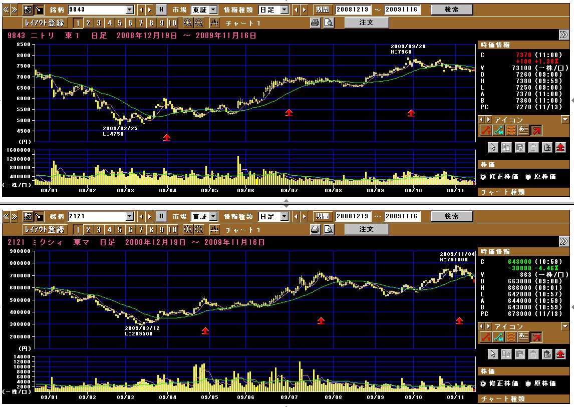 この2つの日足を見ますとね、丁度、1月ほど、ニトリの山がはやいのです 今買うなら、ニトリの方が、リカクが早いかも知れませんよー