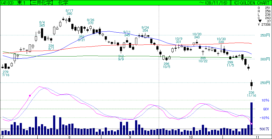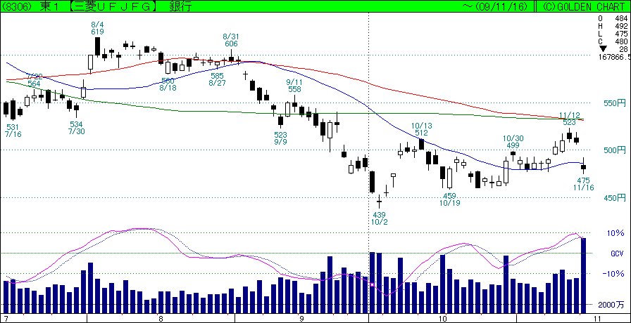 この週末にかけて、8306 三菱UFJ、4183 三井化学、6501 日立製作所が相次いで公募増資による資金調達を発表。この三社の株価は添付チャートの通りでござる。