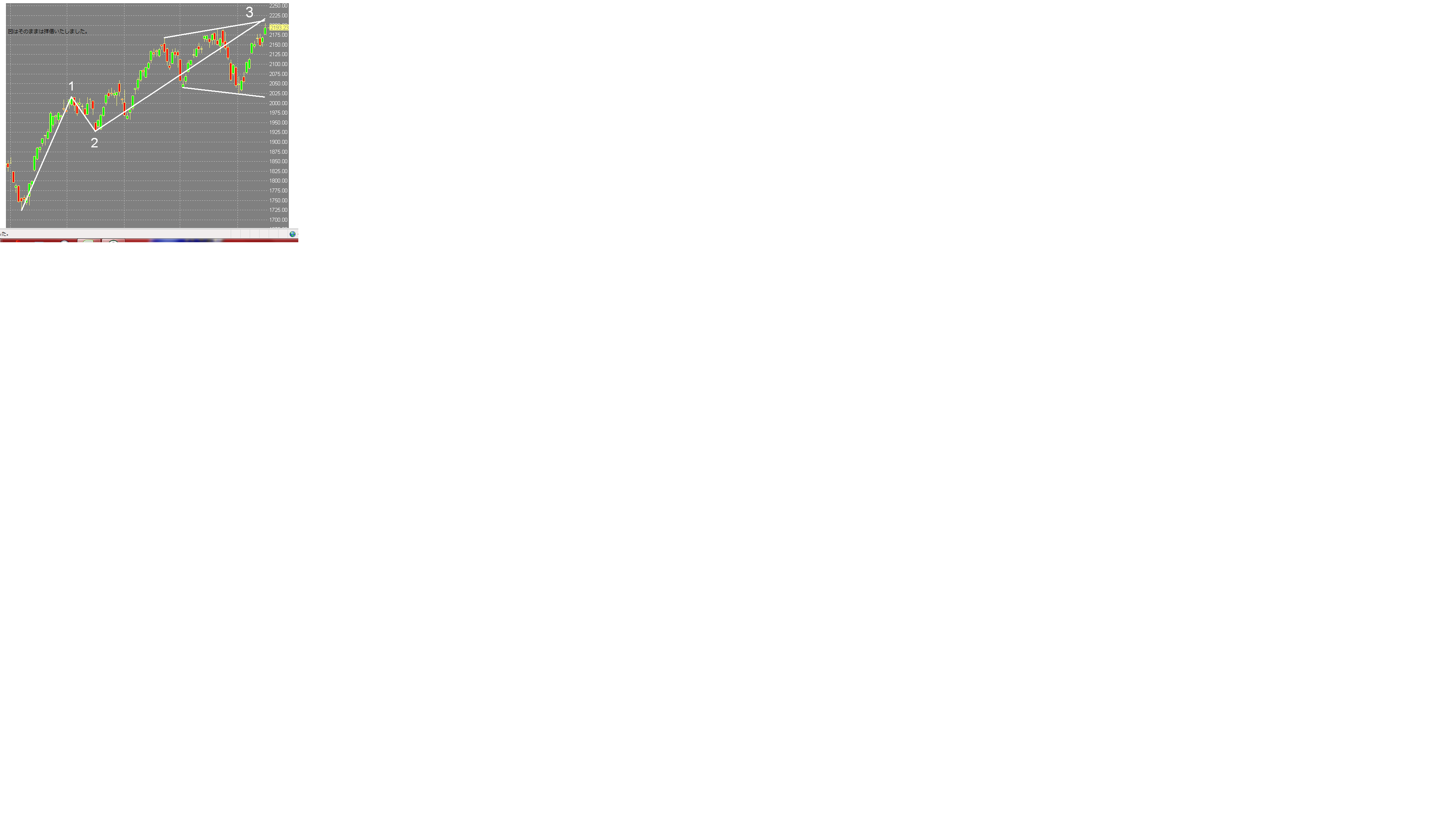 ・高値更新したのでヘッドアンドショルダーの可能性は低くなった、現在は「メガフォンフォーメーション」であり、上のトレンドラインをブレイクしたらターゲットは2286、下のトレンドラインをわりこんだら目指すは1990、、、らしい
