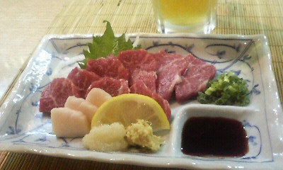 馬刺しは しょうが醤油で ちゅっるっと 本場うまいです