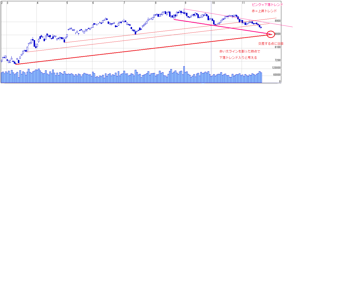 日足では短期では下落トレンド(ピンク)ですが、中期では上昇トレンド維持してます(赤ライン)