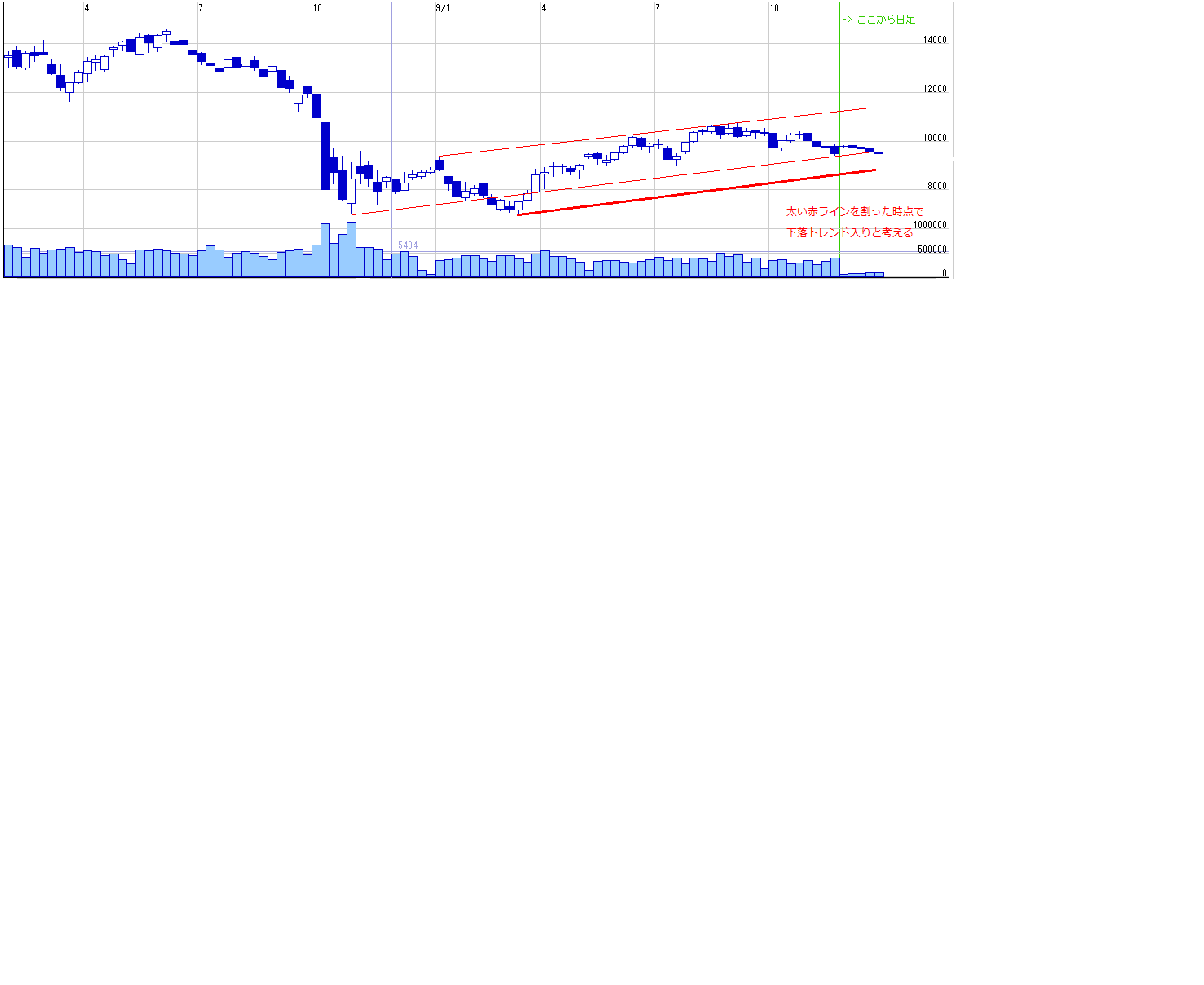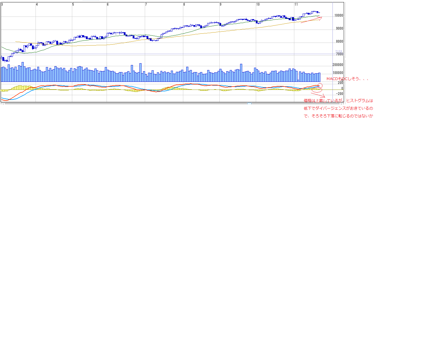 日足、週足いづれもかろうじて上昇トレンドを維持していますので、弱気転換は赤い太ラインを割ってからでも遅くないと思います。このラインを割れるまでは押し目買いスタンスで行きたいと思います。(ただし割ったら逃げます)