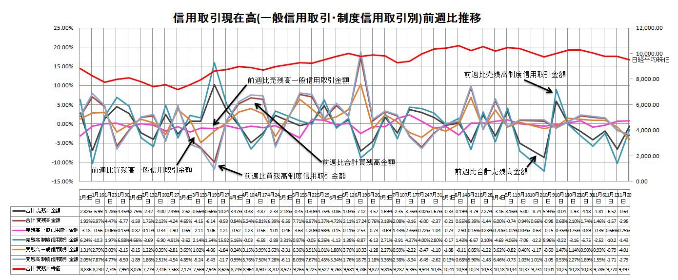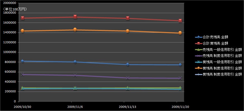 東京証券取引所が発表した11月20日申込時点の信用取引の買い残高(東京・大阪・名古屋3市場、制度信用と一般信用の合計)は先週に引き続き減少した。買い残高は前の週(11月13日申し込み時点)に比べ504億円減の1兆6398億円。