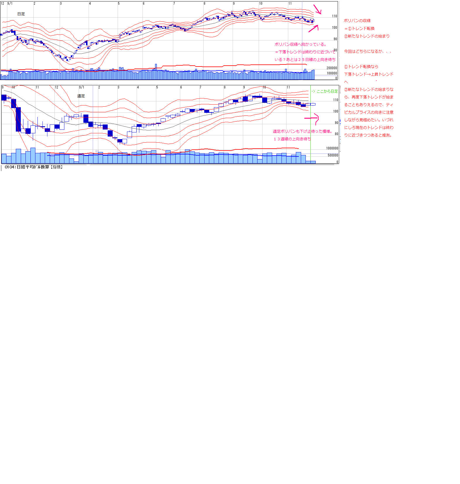 上下どちらにボリバンが拡張するかの見極めのためには、ティピカルプライス(中心線、図の場合は中心線は日足25日、週足13週です)の向きが大切です。