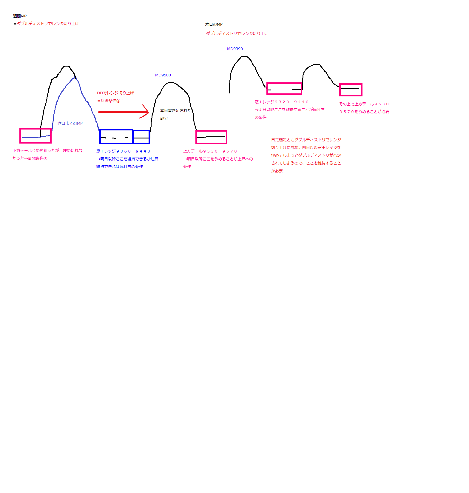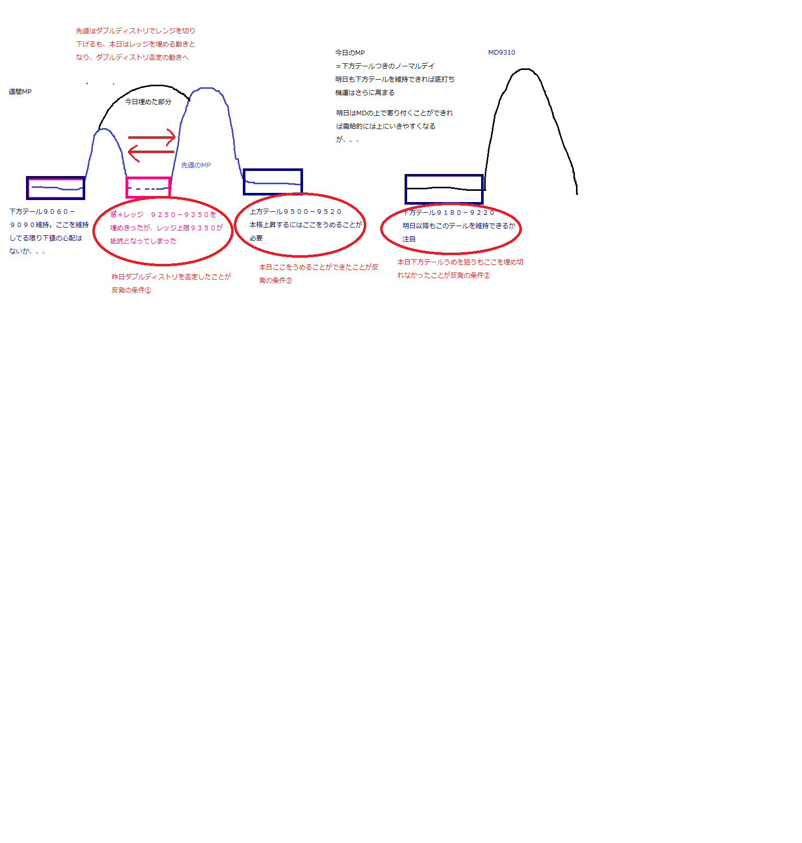 ただし逆に本日の窓+レッジをうめる動きとなった場合にはダブルディストリ否定で上へのレンジ切り上げ失敗、、、