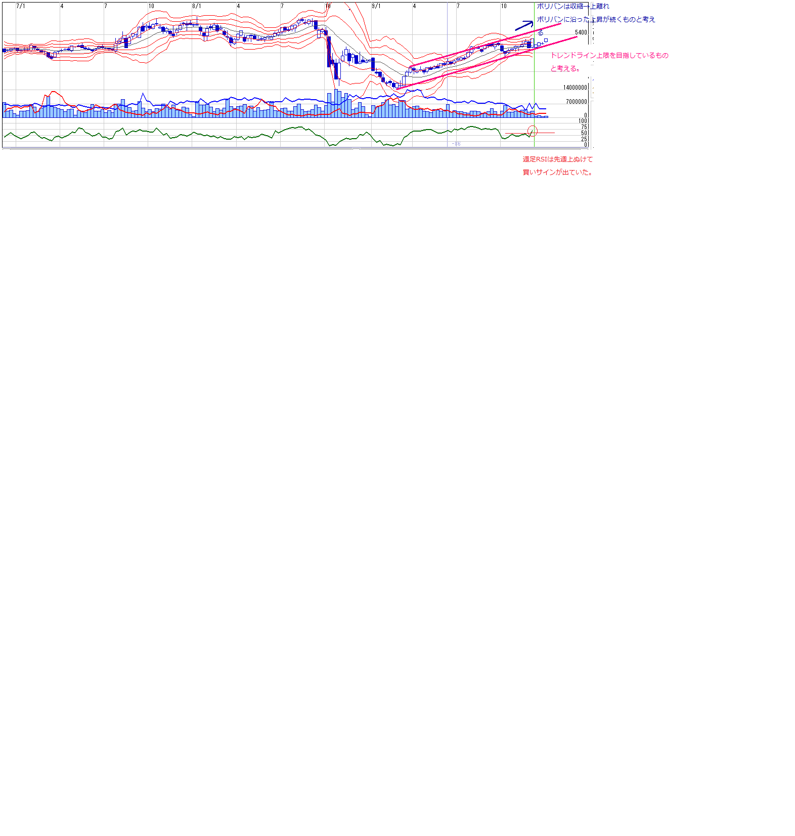 ・日足チャートは弱めですが、週足チャートは先週買いサインがでており、ボリバンも収縮から再度拡張しだしたので、新たなステージが始まった可能性ありです。