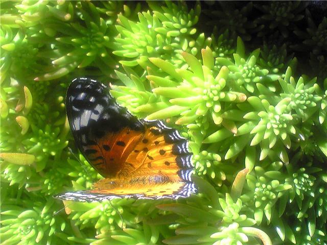 蝶の オレンジ色と 黄緑色の葉っぱ が 、眩しいですね~ 。