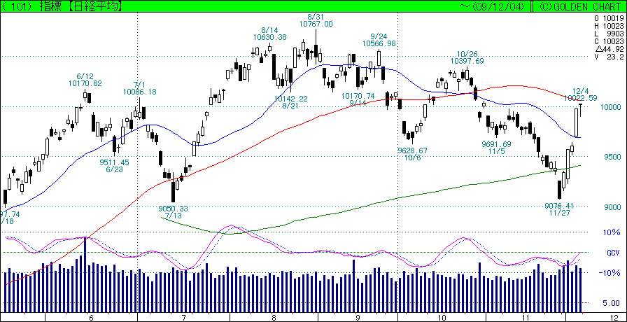 問題は今週、この日経¥10,000どころの抵抗線を越えられるかどうか。週末のシカゴCMEや為替は高値で引けており、材料的には悪くないので、週明けは高く寄りそうかと。