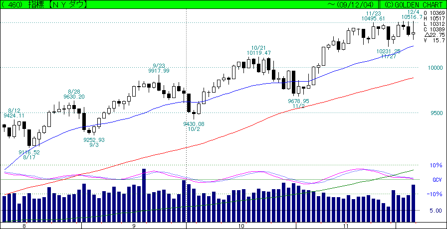 もうひとつ気になるのが、紐育ダウ(日足・右側緑色チャート)でござる。これがずっと$10,500近辺で上値を抑えられており、ここまで快調に上げてきたものの、そろそろ上値が重くなってきているように思われまする。